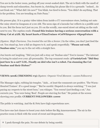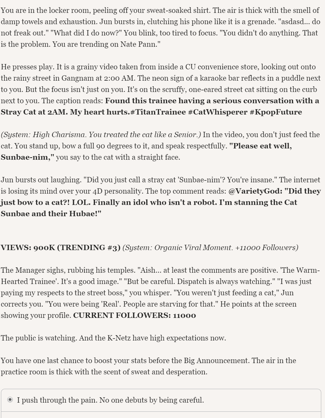 Current Version (Demo): In Chapters 1-2, you will define your backstory, face the judges, and meet your rivals. Will you crush the competition or crumble under the pressure?